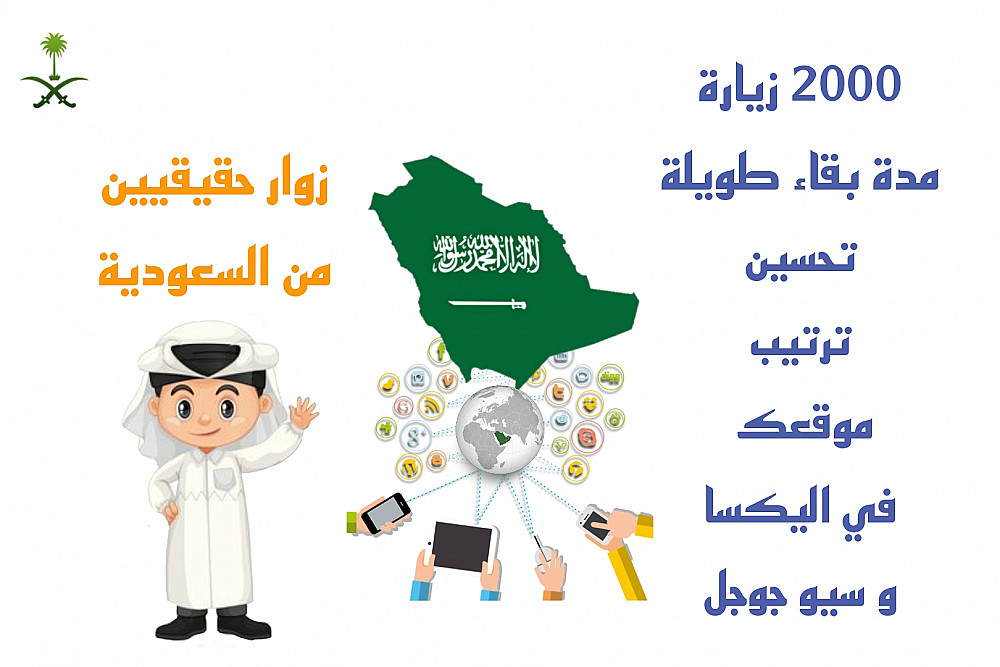 سأقوم بإرسال زوار لموقعك من السعودية زوار سعوديين مدة بقائهم طويلة. 2000 زائر من السعودية لموقعك مقابل 5 دولار. ارسل لك زوار حقيقيين من السعودية مدة بقائهم طويلة لتحسين أليكسا والسيو زيارات حقيقية 100%.