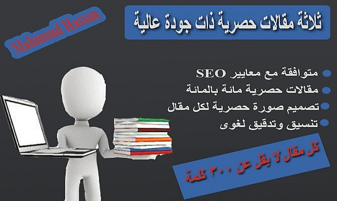 سأقدم لك ثلاثة مقالات حصرية 300كلمه متوافقة مع معايير السيو وذات جودة عاليه ستساعدك فى رفع ترتيب موقعك وتحسن ظهره فى محركات البحث , يمكن تقديم الخدمه كبحث علمى , سيحتوى المقال على بعض الصور التوضيحية , وسأقوم بتنسيقه ليلائم اختيارك